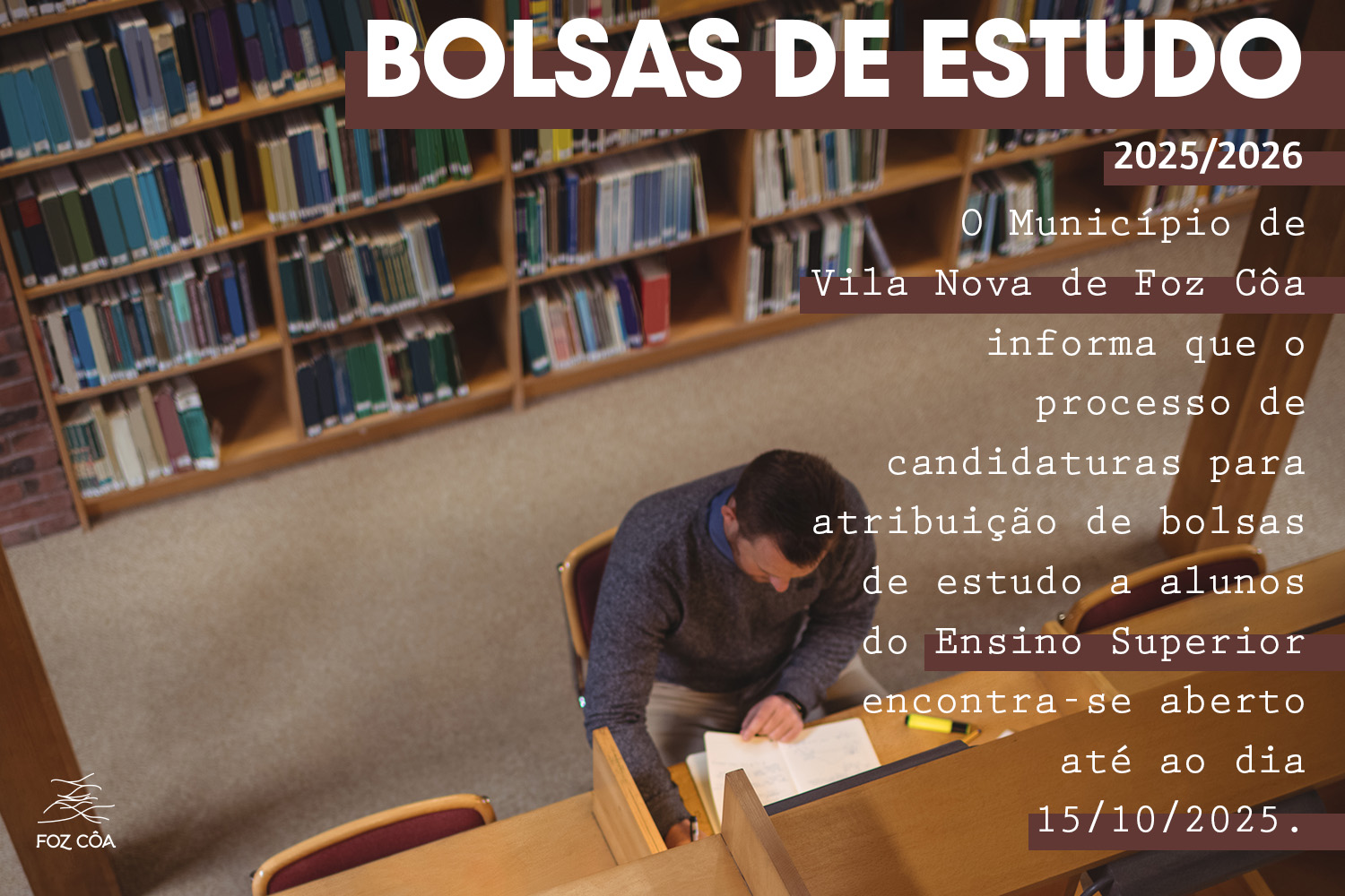 Estão abertas as candidaturas para atribuição de Bolsas de Estudo a alunos do Ensino Superior, entre 08/09/2025 e 15/10/2025.