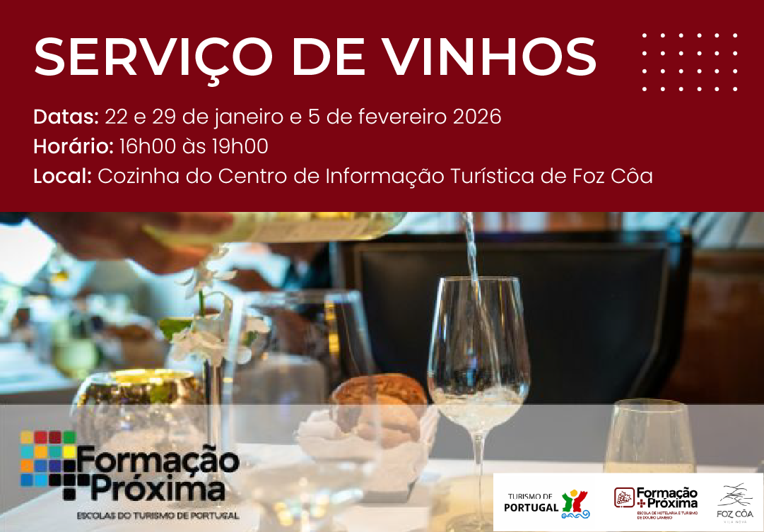 O Município de Vila Nova de Foz Côa, em parceria com a Escola de Hotelaria e Turismo do Douro-Lamego e no âmbito do programa Formação + Próxima do Turismo de Portugal, I.P., vai promover a ação de formação “Serviço de Vinhos”.